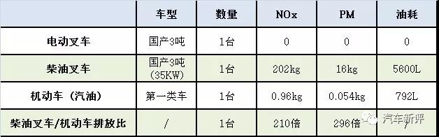 柴油叉车与汽油机动车、电动叉车年排放对比