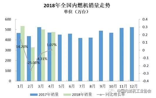 数量方面,2018年4月完成内燃机销量[1],75.45万台,环比下降5.21%,同比增长1.07%;累计销量1839.43万台,累计同比下降3.14%。