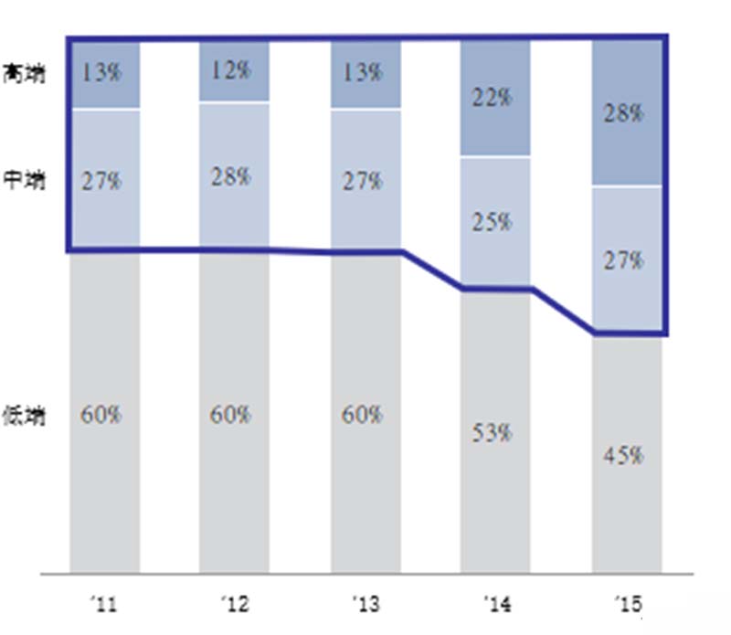 2011年到2015年 轻卡市场高中低端产品占比变化