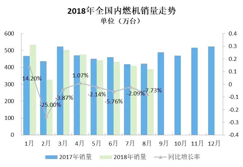 根据中国内燃机工业协会《中国内燃机工业销售月报》数据,2018年8月全国内燃机销量继续下降,市场表现较为平淡,1-8月整体表现较为稳定,与上年同期比略有下降,基本符合预期。