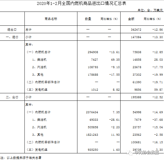据海关总署数据整理,1-2月内燃机行业进出口总额34.25亿美元,同比增长-12.86%,其中,进口14.71亿美元,同比增长-13.30%,出口19.54亿美元,同比增长-12.52%。