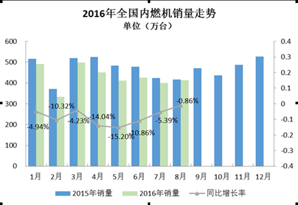 根据中国内燃机工业协会《中国内燃机工业销售月报》重点企业数据显示,数量方面,2016年8月完成内燃机销量413.15万台,环比增长3.12%,同比下降0.86%,累计完成3424.12万台,同比累计下降8.72%;功率方面,2016年8月完成17952.74万千瓦,环比增长4.03%,同比增长24.67%,累计完成功率148694.1万千瓦,同比累计增长9.25%;本月销量较7月有小幅增长,其中仅工程机械用及园林机械用环比下降;同比方面农机用、船用、摩托车用降幅较大;累计销量同比降幅仍近9%;柴油机销量持续低位徘徊,汽油机总体小幅下降。