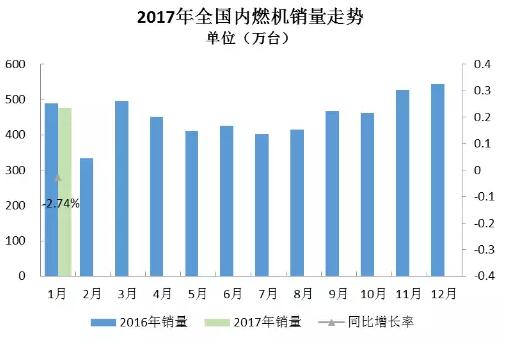 2017年2月,柴油机市场稳步回升,汽油机平稳增长;各细分行业除船用、发电机组有小幅下降外,其余销量均出现不同程度涨幅。