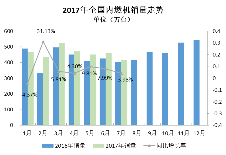 根据中国内燃机工业协会《中国内燃机工业销售月报》重点企业数据显示,数量方面,2017年7月完成内燃机销量[ 包含105家内燃机整机企业及摩托车发动机数据]417.25万台,环比下降9.33%,同比增长3.98%;累计完成销量3228.15万台,累计同比增长7.29%;功率方面,2017年7月完成18461.95万千瓦,环比下降7.15%,同比增长6.24%,累计完成145894.30万千瓦,累计同比增长11.09%。销量环比小幅下降,同比增幅放缓,累计销量增加仍比较明显。柴油机市场回落趋势继续但累计同比增幅仍保持较高程度,汽油机环比小幅下降,累计销量仍增长状态;各细分市场销量本月较上月有不同程度下降,累计销量同比除船用、发电机组用有一定下降外,其余销量仍表现为不同幅度增长状态。